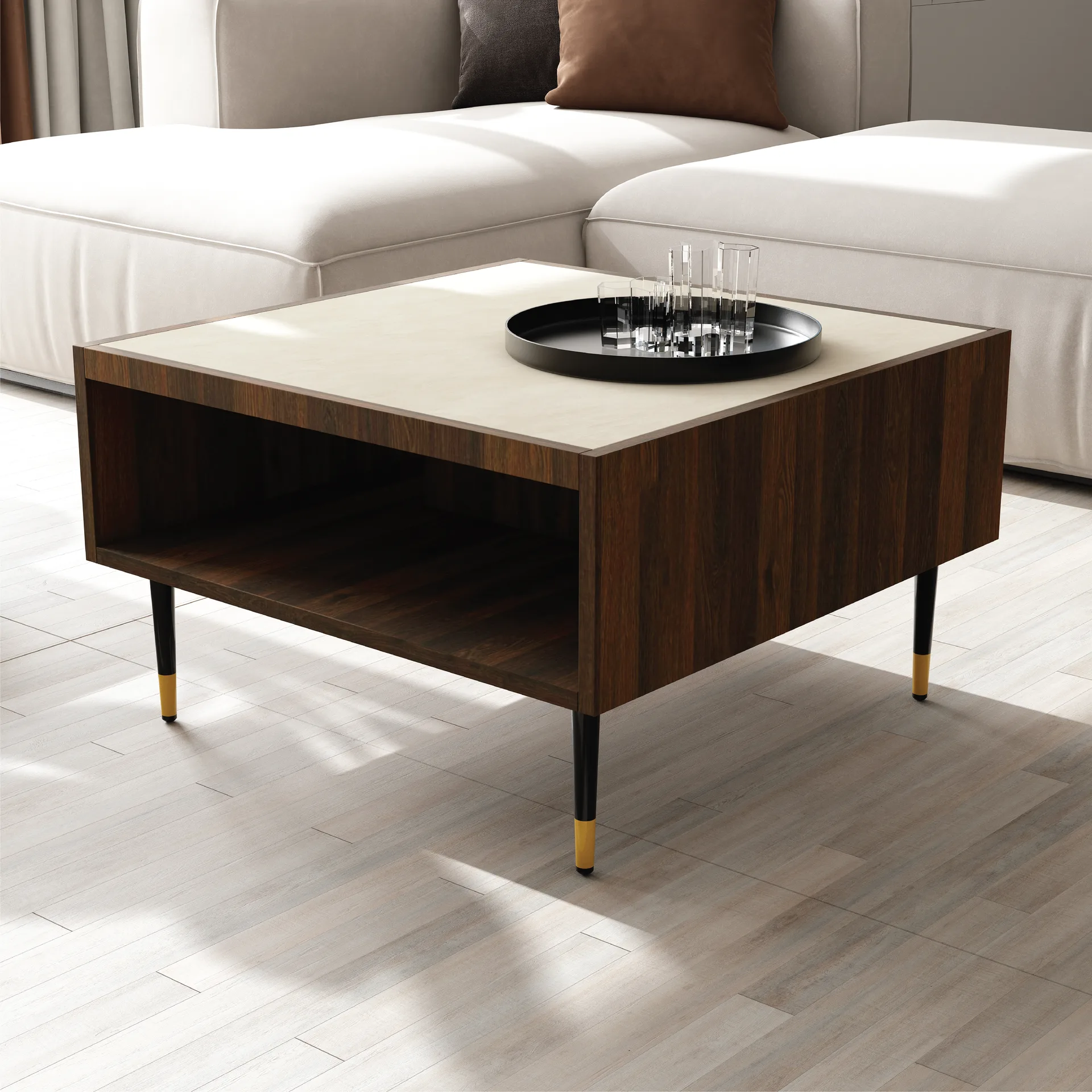 Stolik wyposażono w otwartą półkę pod blatem, która zwiększa jego funkcjonalność – to idealne miejsce na książki, gazety czy inne drobiazgi, które chcesz mieć zawsze pod ręką. Dzięki kwadratowemu kształtowi doskonale odnajdzie się zarówno w mniejszych przestrzeniach, jak i jako element większego zestawu mebli wypoczynkowych.