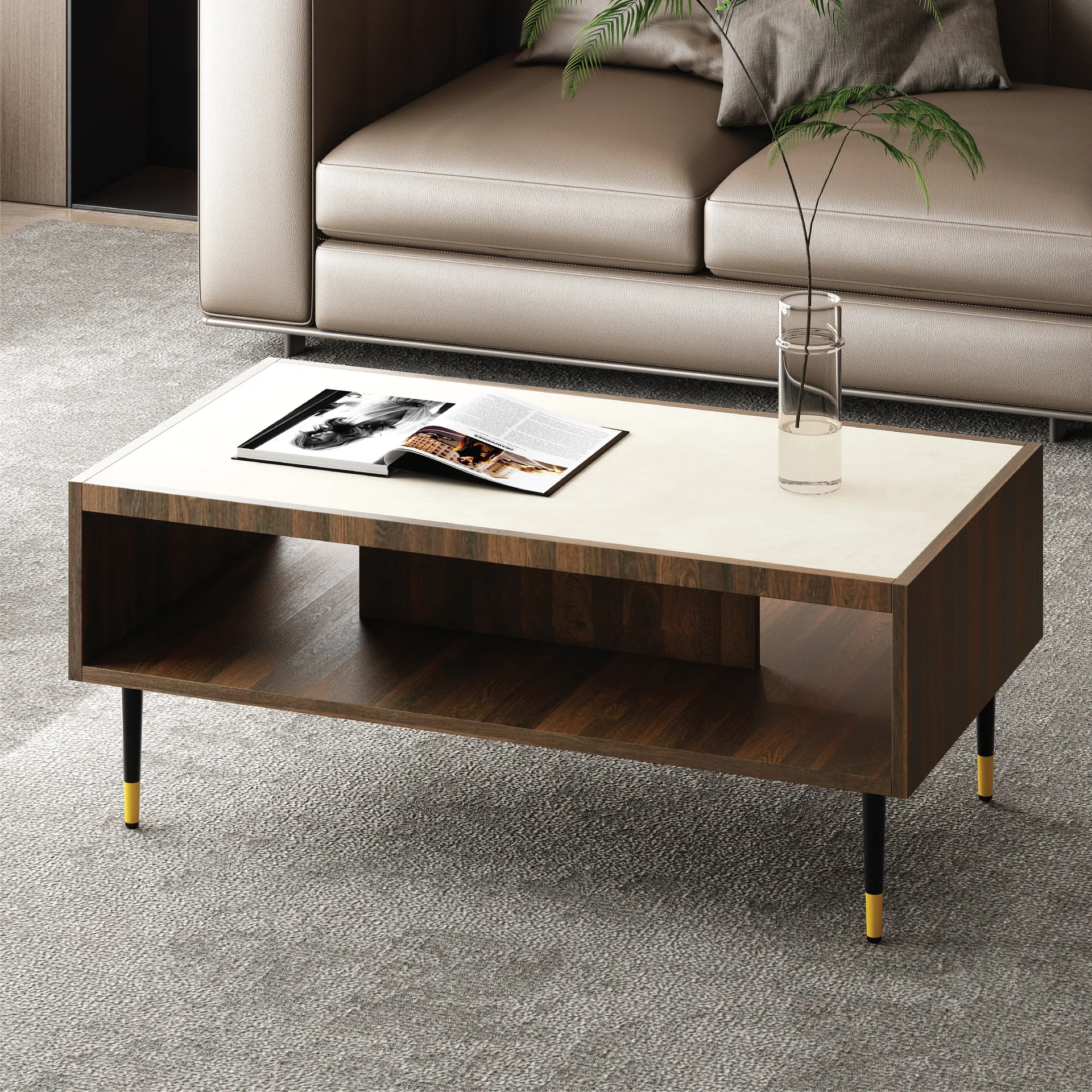 Prostokątny blat zapewnia większą przestrzeń użytkową, co czyni ten model idealnym centrum codziennych spotkań – na kawę, książkę czy dekoracje. Pod blatem znajduje się otwarta półka, która zwiększa funkcjonalność stolika i pozwala na wygodne przechowywanie najpotrzebniejszych drobiazgów.